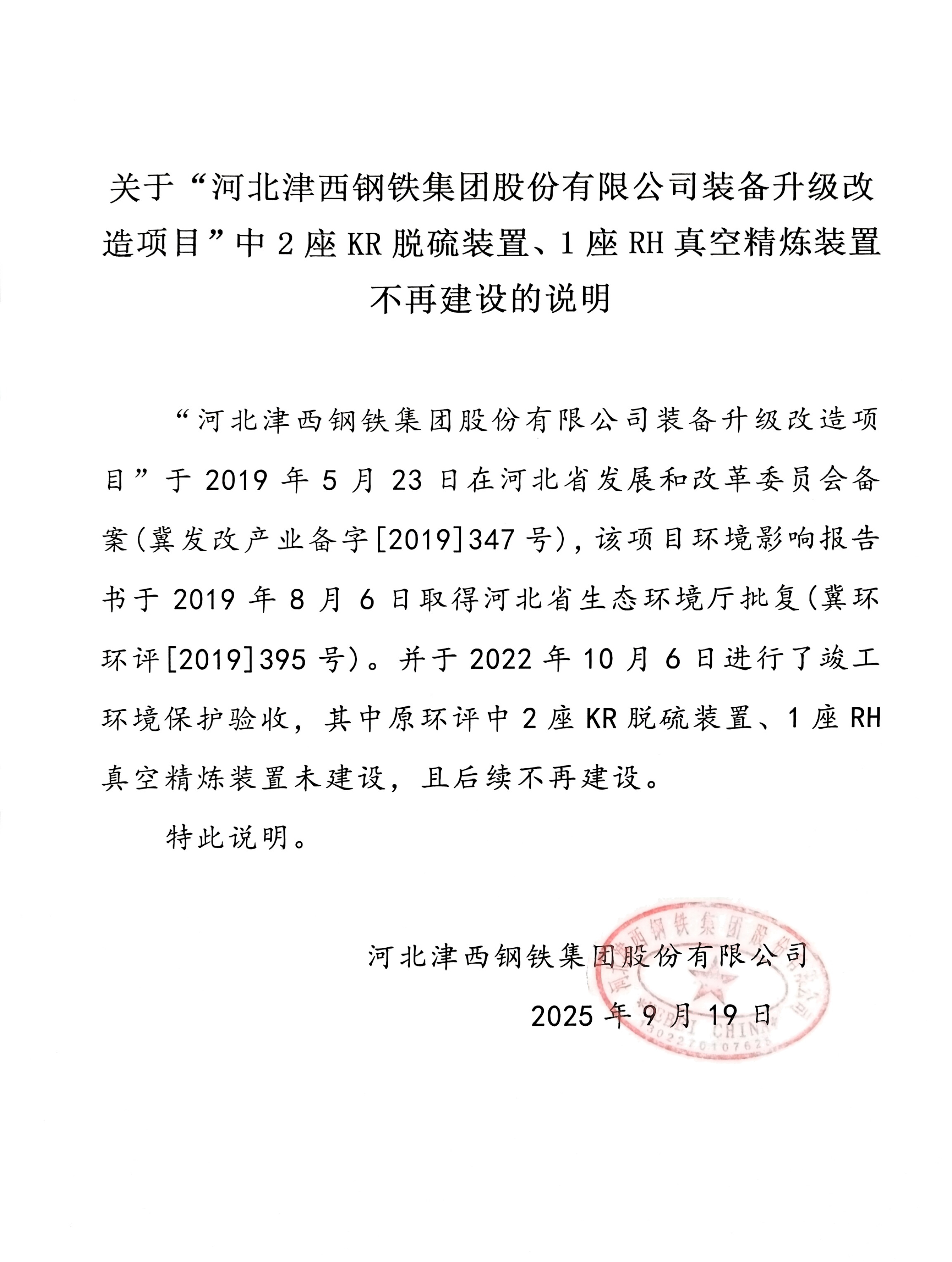 关于“河北津西钢铁集团股份有限公司装备升级改造项目”中2座KR脱硫装置、1座RH真空精炼装置不再建设的说明