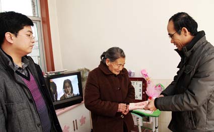 图为工会副主席王继宗代表公司将救助金送到公司员工刘维中母亲手中。