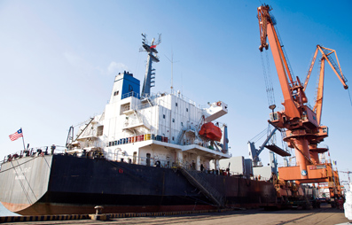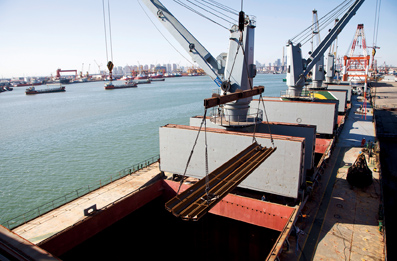 图为津西热轧钢板桩产品在天津新港外贸码头装船。
