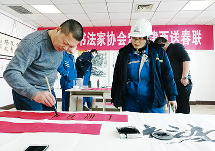 在新春佳节即将到来之际,为弘扬中华传统文化,营造喜庆节日氛围,1月16日上午,津西股份首次举办“迎新春送墨香——春联进工厂”活动。活动邀请唐山市书法家协会5名书法家,在公司新办公楼5层党群活动服务中心现场泼墨赠送春联,公司多名书法、春联爱好者前往观摩、学习,并与书法家交流。 写春联,是国粹;送春联,既是送温暖,也是送吉祥。活动现场,书法家尽情挥毫,将真诚的祝福赋之笔端。爱好者指定内容特邀书法家书写,“七言、九言、大福字”等祥和喜庆的新春对联逐渐摆满书画苑和图书馆,更有员工单独为家里长辈求得“寿”字。“转型升级经营谱新曲,精益管理发力进世强”“迎喜迎春迎富贵,接财接福接平安”……喜庆的红纸为底,黑墨为字,一副副精彩的作品彰显出喜气洋洋的气息。大家拿着吉祥喜庆的春联,脸上荡漾着幸福的喜悦。 据悉,5名书法家共书写送出春联100余副,到场的书法爱好者都如愿以偿拿到自己心仪的作品。 津西股份相关人员介绍,今年属于首次举办春联进工厂活动,以后每年将举办此类活动,以传承书法艺术,颂扬津西健康持续的高质量发展,送去对津西人的关爱和最美好的新春祝福。